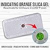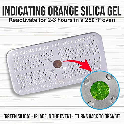 Desecante indicador reutilizable: las perlas cambian de naranja a verde, lo que significa que es hora de cargar. Coloque el frasco en un horno a 280-300 ° F durante 2 a 3 horas, o hasta que las cuentas se vuelvan anaranjadas nuevamente. Las perlas sobresaturadas pueden extender el tiempo de activación.