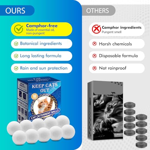 Amplia aplicación: bolas repelentes para perros y gatos recién formuladas y empaquetadas individualmente con al menos 0.11 onzas de aceites esenciales cada una. Aroma de larga duración (más de 15 a 20 días; evita la humedad y la lluvia). Nuestra bola disuasoria para gatos es adecuada para zonas ventiladas en interiores y exteriores: césped, patio, jardín, porche. Eficaz para gatos de pelo corto, pelo duro, Maine, orejas rizadas y la mayoría de los gatos/perros salvajes: protección integral para el hogar.