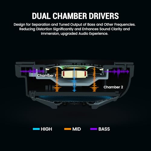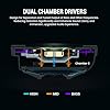 Diseño de doble cámara: Con un innovador diseño de doble cámara, los sonidos de baja y alta frecuencia se procesan por separado para garantizar que todos los rangos de frecuencia se puedan optimizar de forma independiente. La cámara de baja frecuencia mejora los efectos de graves profundos y completos, mientras que la cámara de alta frecuencia ofrece agudos claros y brillantes, creando una experiencia de sonido más rica y dimensional. Esto mejora los detalles de sonido y la precisión en los juegos, mejorando así la experiencia general de juego.