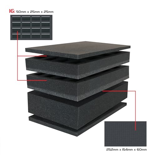MINIS BARRACKS – House your collection of PCs, NPCs, monsters across 3 integrated miniatures foam trays: 16-slot tray for 28mm figures, 8-slot tray for medium figures, and a customizable foam tray