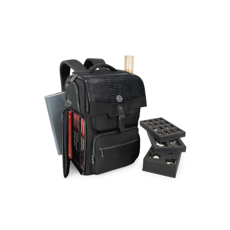 GAME MASTER’s CAMPAIGN BACKPACK – A D&D equipment chest with comfy straps designed to carry an adventurer’s hoard of supplies: 6-8 RPG books, up to 18″ laptop, 1-2 binders, DM screen, 25+ minis, more