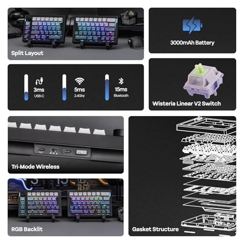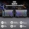 Teclado RGB de larga duración: Estética y funcionalidad, el teclado RGB split70 ofrece ambas luces de atmósfera vibrante consistente, desde 71 LED orientados al sur personalizables en saturación, tono, brillo y velocidad. Equipado con una batería recargable de 3000 mAh, el teclado inalámbrico Split70 está listo para horas de uso a largo plazo con estabilidad y baja latencia de 1000 Hz (2.4 G/Cable).