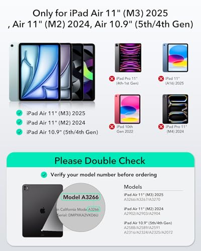 Compatibilidad: solo para iPad Air de 11 pulgadas (M3/M2) 2025/2024, iPad Air 10.9 pulgadas (5ª/4ª generación) 2022/2020; Modelos: A3266, A3267, A3270, A2902, A2903, A2904, A2588, A3270, A2902. 2589, A2591, A2316, A2324, A2325, A2072