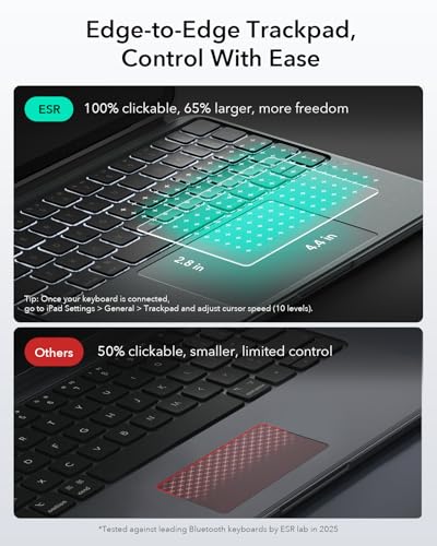 Trackpad más grande: el trackpad totalmente sensible y un 65% más grande cuenta con una superficie de 112 × 2.756 in, proporcionando un control más suave y preciso; este teclado para iPad mejora la navegación con soporte completo de gestos iOS para facilitar la edición, navegación o cambiar de aplicaciones