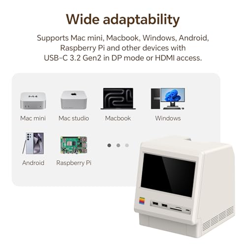 Especificaciones: Estación de acoplamiento retro M5 para Mac mini M4, pantalla HD de 5 pies, carcasa SSD NVMe M.2 de 10 Gbps, lector SD/Micro SD 4.0, 4 USB-A 1 USB-C 10 Gbps, conector para auriculares de 0.138