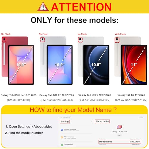Compatibilidad perfecta: esta funda es compatible con Samsung Galaxy Tab S10 Lite 5G de 10.9 pulgadas (modelo SM-X400/X406B) versión 2025, Samsung Galaxy Tab S10 FE 5G 10.9 pulgadas (modelo SM-X520/X526B/X528U) versión 2025, Samsung Galaxy Tab S9 FE 5G 1 0.9 pulgadas (modelo SM-X510/X516B/X518U), Samsung Galaxy Tab S9 de 11 pulgadas (modelo SM-X710/X716B/X718U) tableta de lanzamiento 2023. No funcionará para ningún otro dispositivo modelo
