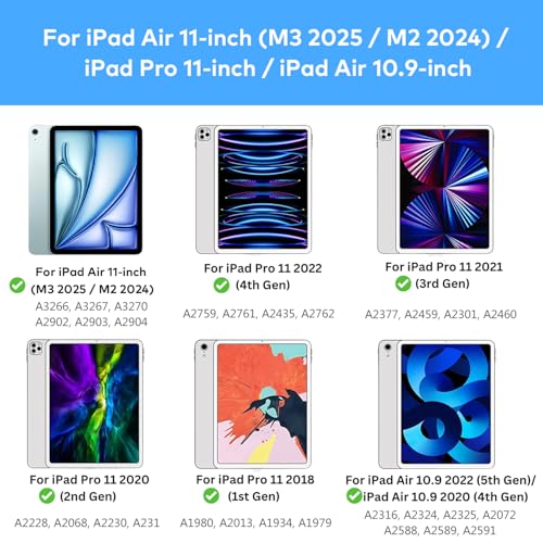 Compatibilidad: esta funda de teclado delgada de alta calidad es perfectamente compatible con iPad Air 2025 M3 de 11 pulgadas (A3266, A3267, A3270), M2 iPad Air 2024 de 11 pulgadas (A2902, A2903, A2904), iPad Pro 2022 de 11 pulgadas de 4ª generación (A2433). 5, A27 59, A2761, A2762), iPad pro 2021 de 11 pulgadas de 3ª generación (A2377, A2301, A2459, A2460), iPad pro 2020 de 11 pulgadas de 2ª generación (A2228, A2068, A2231), iPad pro 11 2018 pulgadas 1ª generación (A) 1980, A2013, A1934, A1979), iPad Air 2022 5ª generación (A2588, A2589, A2591), iPad Air 2020 de 4ª generación (A2072, A2316, A2324, A2325).