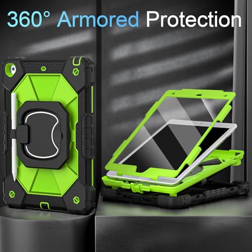Funda para iPad de 9ª generación, funda para iPad de 9ª, 8ª y 7ª generación, iPad de 10.2 pulgadas, con protector de pantalla, soporte para bolígrafo, soporte giratorio de 360°, negro, amarillo