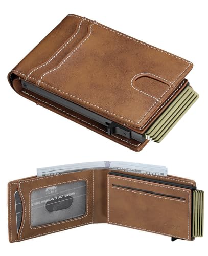 Billetera de diseño mejorado: La billetera inteligente para hombres Slim marca la tendencia con su diseño de clip de expulsión automática, asegurando que las tarjetas permanezcan en su lugar de forma segura sin la preocupación de caídas accidentales. Funda de cuero totalmente envuelta, ajuste perfecto, garantiza que el cuero y la funda de tarjetas nunca se separen. La resistente funda para tarjetas garantiza que la cartera nunca se deforma en comparación con las carteras tradicionales.