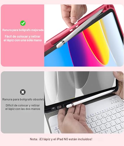 Práctico portalápices: para iPad 10ª generación funda de teclado diseñada con soporte para lápices y ranura para bolígrafo en la parte superior, el recorte en la parte posterior hace que sea fácil sacar el lápiz para su uso. El teclado BT bien diseñado es muy sensible. No hay retrasos al escribir. NOTA: Stylus no está incluido