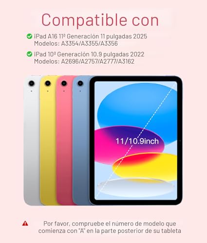 Funda para iPad de 10.ª generación con teclado de 10.9 pulgadas: esta funda de teclado es compatible con iPad A16 de 11ª generación de 11 pulgadas 2025 (modelo: A3354, A3355, A3356), compatible con iPad de 10.9 pulgadas 2022 (modelo: A2696, A2757, A27777) 7, A31 62). No es compatible con otros modelos. Comprueba el número de modelo que comienza con «A» en la parte posterior de tu tableta antes de comprar