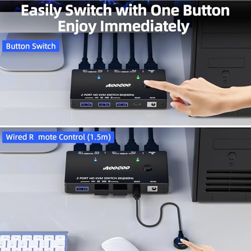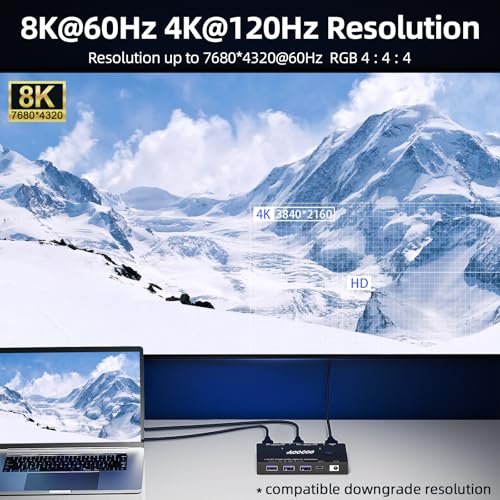 【Support up to 8K@60Hz】The KVM switch supports resolution up to 8K@60Hz/4K@120Hz. Please use 8K HDMI cables, and the shorter the cable length, the better, as this will ensure a more stable signal.