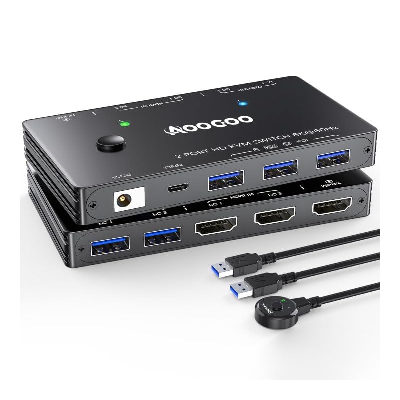 Especificaciones: HDMI KVM Switch 2 Computers 1 Monitors, 8K@60Hz/4K@120Hz Monitor KVM Switch 2 Port for 2 PCs Share 1 Monitor, with 3 USB3.0 Ports, USB Cables and Power Adapter (8K HDMI 2 in 1 Out KVM)