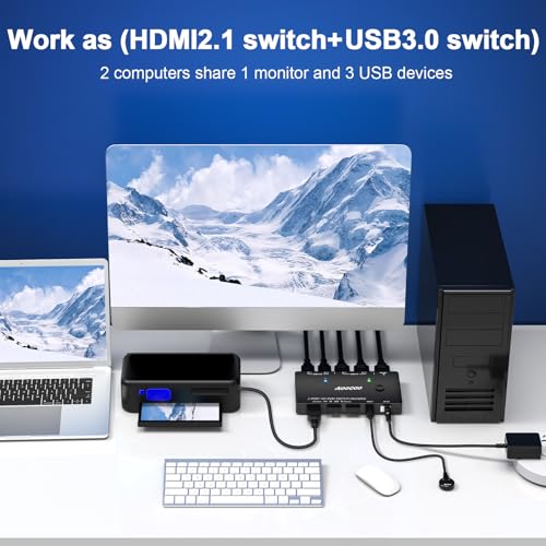 HDMI KVM Switch 2 Computers 1 Monitors, 8K@60Hz/4K@120Hz Monitor KVM Switch 2 Port for 2 PCs Share 1 Monitor, with 3 USB3.0 Ports, USB Cables and Power Adapter (8K HDMI 2 in 1 Out KVM)