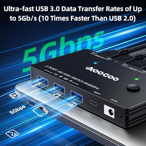 【 3 USB 3.0 Ports】Dual monitor kvm switch with 3 USB 3.0 ports which can recognize keyboard,mouse,printer,scaner and other USB devices. USB 3.0 offers data transfer speeds of up to 5Gbps, while USB 2.0 offers data transfer speeds of only 480Mbps.☛Note:If the input USB3.0 ports are not connected to the KVM or connected incorrectly, the output USB device will not be recognized.