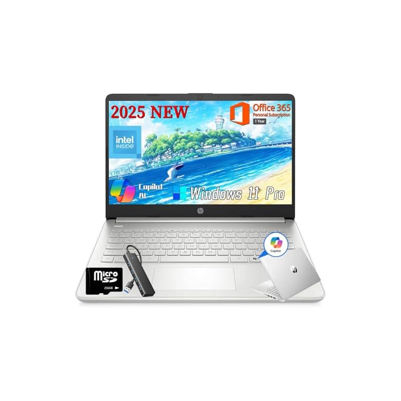 HP 2025 Laptop de negocios estudiantil de 14 pulgadas, procesador Intel N150, 16 GB de RAM, 384 GB de almacenamiento (128 GB UFS+256 GB MSD), llave de copilot, alimentado por IA, 1 año Office 365