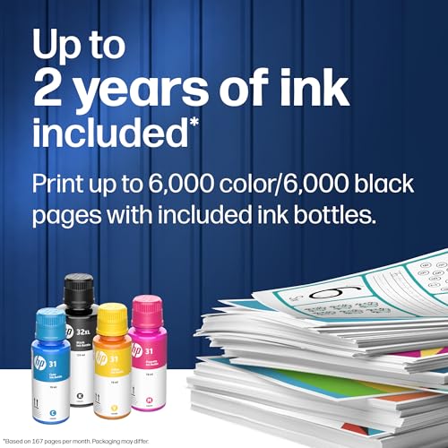 LLENO DE AHORROS – Indeterminado para impresión de chaparro costo y chillón volumen: incluye hasta 2 años de tinta HP; puedes imprimir hasta 6,000 páginas a color o en negro a quemarropa desde la caja