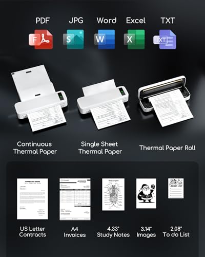 Impresora térmica [impresión multitamaño]: La impresora portátil inalámbrica con papelera incorporada, soporte de papel térmico en rollo, papel térmico continuo y de una sola hoja. Esta pequeña impresora inalámbrica también admite 5 tamaños de papel térmico: 8.5″ X 11″ US Letter, A4, 4.33» (4.331 in), 3.14» (3.150 in), 2.08» (2.087 in) de ancho, puede satisfacer la mayoría de sus necesidades