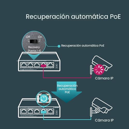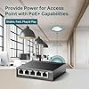 [Configuración flexible Full Gigabit PoE de 5 puertos] 4 puertos RJ45 PoE+ (802.3at/af) 10/100/1000 Mbps que proporcionan hasta 30 W por puerto y un presupuesto total de energía PoE de 65 W, junto con 1 puerto Gigabit no PoE para conexiones de alta velocidad.