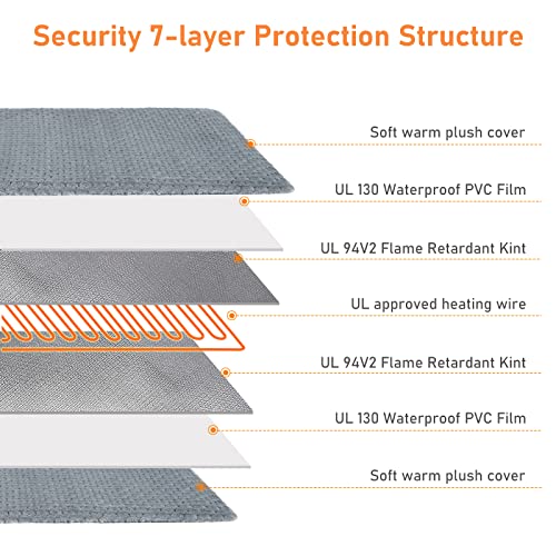 Diseño único de seguridad: con el fin de evitar que los perros muerdan el alambre y se electrocuten, el alambre está envuelto por una cubierta masticable en espiral. Estructura protectora de 7 capas con alambre calefactor certificado UL que protege a las mascotas de quemaduras. Sobre de PVC suave con función impermeable e ignífuga. Sensor de temperatura inteligente integrado en la almohadilla térmica para evitar el sobrecalentamiento y proteger a las mascotas. No dejes que tus mascotas se acuesten en la almohadilla térmica para mascotas sin una funda de felpa.
