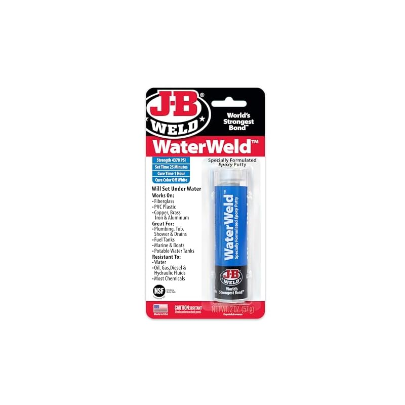 J-B WELD WATERWELD: Una masilla epoxi mezclable a mano de dos partes, que puede curar bajo el agua y es ideal para reparar tuberías, tanques de combustible, bañeras y duchas, desagües, piscina y spa, botes y tanques de agua potable y mucho más. J-B Weld WaterWeld está certificado por la NSF y es seguro para el contacto con agua potable.