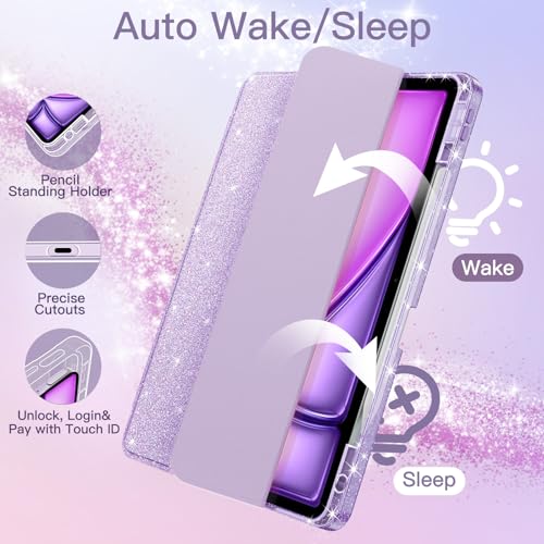 JETech Funda con purpurina para iPad Air de 13 pulgadas M3/M2 (2025/2024) con soporte para lápices, bonita funda delgada brillante para niños y niñas, carcasa trasera transparente brillante (morado)