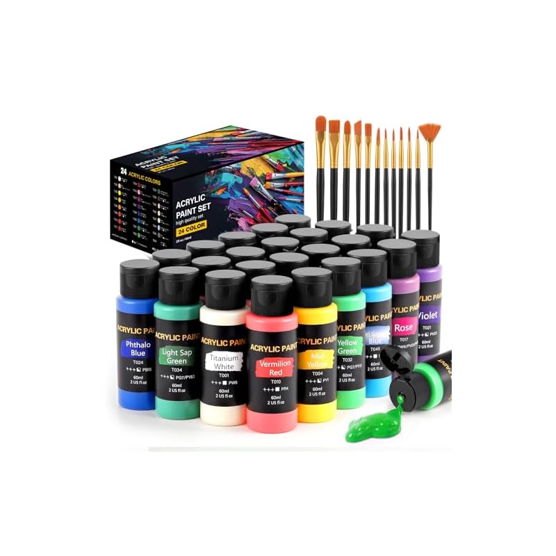 Juego de pintura acrílica, 24 colores (2 onzas/botella) con 12 pinceles de arte, suministros de arte para pintar lienzo, madera, cerámica y tela, pigmentos ricos de calidad duradera para principiantes
