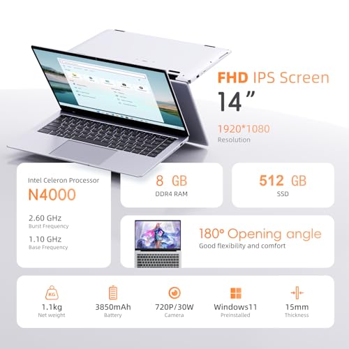 Especificaciones: JUSTTHINK Computadora portátil plateada de 14 pulgadas, procesador Inter de hasta 2.6 GHz, 8 GB de RAM, SSD de 512 GB, Windows 11, batería de larga duración, portátil ultraligero para estudiantes y