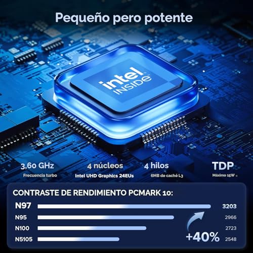 【CPU N97-IN·TEL ALDER LAKE N-SERIES BOSS】La mini PC KAMRUI Essenx E1 W-11 Pro está equipada con el procesador N97 de 12ª generación N Series más potente de In·tel (4C/4T, caché de 6 MB, hasta 3.6 GHz, 15 W TDP), cuyo rendimiento es un 48% más alto que N100/N. 150 y N95. Además, la disipación de calor y la duración de la batería han mejorado enormemente en comparación con la versión anterior KAMRUI AK1PLUS mini pc.