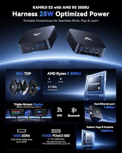Especificaciones: KAMRUI Essenx E3 Mini PC, Ryzen 5 3500U (Beats N150/N97), 16GB RMA 512 SSD Mini computadoras, mini computadoras de escritorio compatibles con LAN dual, pantalla triple 4K, WiFi, BT, oficina, hogar