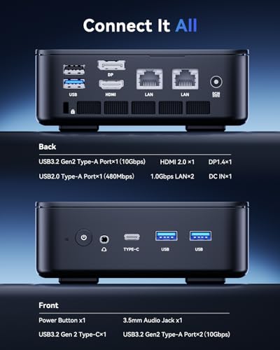 Conectividad completa: este mini PC compacto de escritorio incluye una amplia gama de puertos: 3 puertos USB 3.2 Gen 2, 1 USB 2.0, HDMI 2.0, DisplayPort 1.4, LAN Gigabit dual, un puerto tipo C y un conector de audio de 0.138 in. Admite una integración perfecta con servidores, sistemas de vigilancia, proyectores, monitores y varios periféricos, ofreciendo flexibilidad tanto para uso comercial como de oficina.