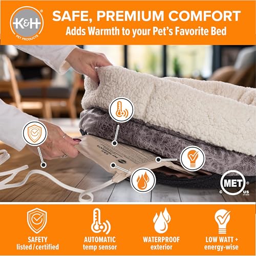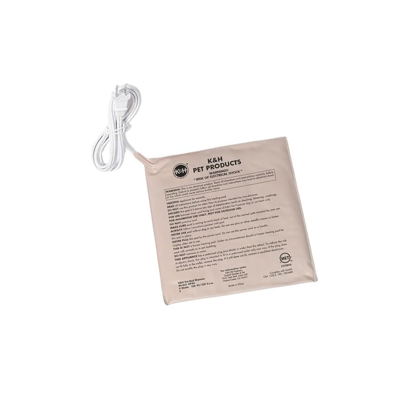 Con la adición de un calentador de cama K&H Pet Products para mascotas, cualquier cama para gatos o perros puede proporcionar comodidad y calidez a tu mascota. Se puede colocar dentro de prácticamente cualquier cama para mascotas y es fácil de usar. ¡Solo tienes que conectarlo! Se convertirá en el lugar favorito de tu gato o perro para dormir la siesta. Los termostatos duales regulan la temperatura utilizando potencia muy baja. El calentador está configurado para mantener la temperatura de la superficie de la cama de tu mascota de 12° a 15° por encima de la temperatura del aire ambiente cuando tu mascota no está en la cama; luego se calienta automáticamente a unos agradables 102 °F cuando la mascota se acuesta sobre la cama. Los calentadores de cama para mascotas K&H están probados y certificados por MET Labs y superan las normas de seguridad eléctrica de EE. UU./CA; K&H no solo utiliza piezas enumeradas en seguridad, certificamos la seguridad de todo el producto. Para uso doméstico en interiores solo con corriente eléctrica de 110/120 voltios. NOTA: No use el calentador de cama para mascotas solo, siempre debe colocarse dentro de una cama para mascotas. No apto para uso en exteriores.