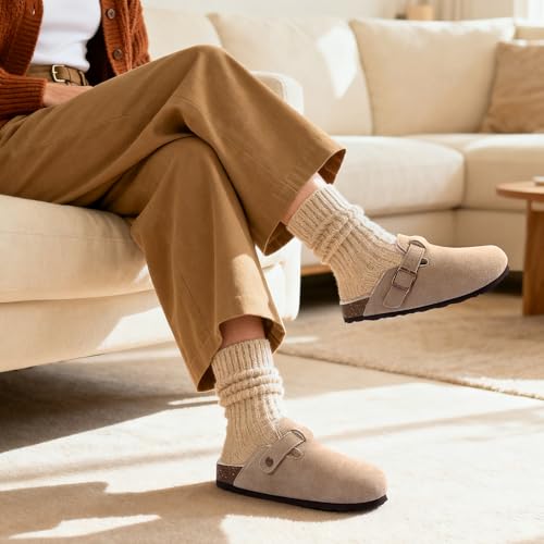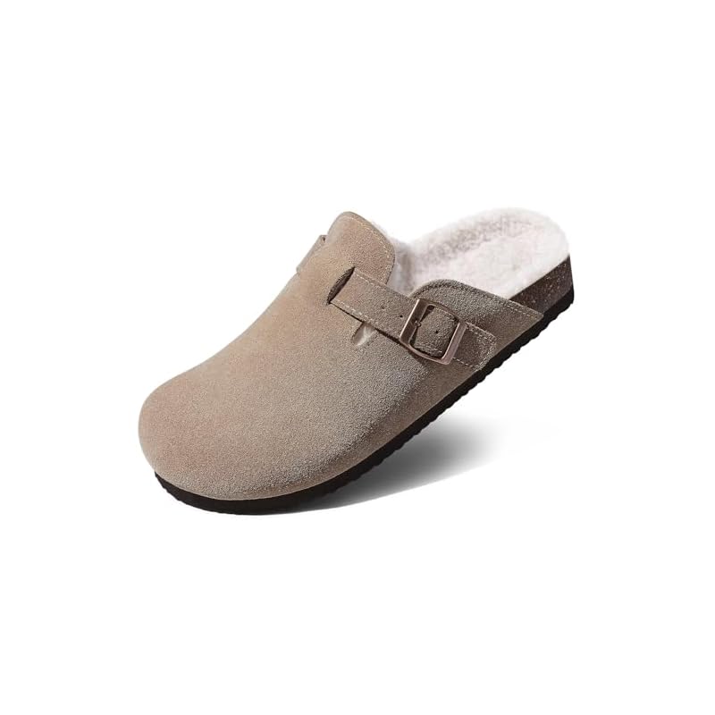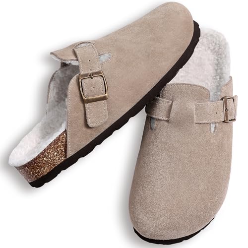 Especificaciones: KIDMI Zuecos de gamuza forrados de piel para mujer, con plantilla de corcho, zapatos de patata de invierno