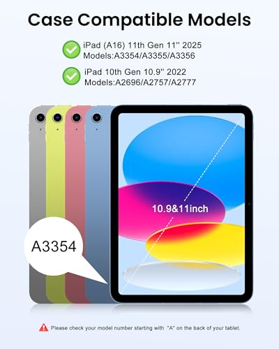 Amplia compatibilidad: la funda de teclado LAMA está diseñada para iPad (A16) de 11ª generación de 11 pulgadas 2025 (modelo: A3354/A3355/A3356) y iPad de 10.9 pulgadas 2022 (A2696/A2757/A2777). No es adecuado para otros iPad de 10.9 pulgadas o iPad de 11 pulgadas. NOTA: Compruebe el logotipo «Axxxx» en la parte trasera del iPad antes de realizar el pedido. o Abrir configuraciones>General>Acerca de>Toque el número de pieza «Mxxxx» para revelar el número de modelo «Axxxx».