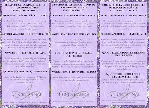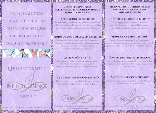 Saco térmico semillas de trigo ecológico y flores de lavanda de la Provenza Francesa. -Hechos artesanalmente el aroma a lavanda ayuda en la relajación, conciliar el sueño y reducir el estrés. Funda lavable 100% algodón. -Empaquetados con mimo en una bonita caja ideal para regalo. -Indicaciones para terapia en calor, alivio de los dolores menstruales, dolores lumbares, dolores cervicales, dolores de espalda, cólicos, artritis, sinusitis y cualquier otra donde este indicado la aplicación de calor. Utilízalo también para calentar tu cama, la cuna de tu bebé, para pies fríos… -Indicaciones para terapia en frío, aliviar inflamaciones, dolor de esguinces, moratones, reducir la fiebre, migrañas, picaduras, pies cansados, varices y cualquier otra donde este indicado la aplicación de frío. -Coloque el cojín térmico sobre un radiador para ambientar su estancia con su agradable aroma a lavanda MICROONDAS: ❖ Comprobar que el microondas funciona correctamente antes de usar. ❖ Verificar la potencia antes de calentar el cojín. ❖ Calentar en un recipiente apto para el microondas. ❖ No calentar junto a ningún plástico ni producto inflamable. ❖ Colocar el cojín plegado y doblado por la mitad. ❖ Antes de usar comprobar que no está demasiado caliente. ❖ Dejar enfriar completamente antes de volver a calentar. 2 minutos HORNO: Calentar el horno a 100°C entre 3 y 6 minutos. ❖ Antes de usar comprobar el correcto funcionamiento del horno. ❖ Calentar en un recipiente apto para el horno. ❖ No calentar junto a ningún plástico ni producto inflamable. ❖ Verificar la temperatura antes de calentar el cojín. ❖ Colocar el cojín plegado y doblado por la mitad. ❖ Antes de usar comprobar que no está demasiado caliente. ❖ Dejar enfriar completamente antes de volver a calentar. INSTRUCCIONES DE ENFRIADO Introducir el cojín dentro de una bolsa de plástico para evitar que se moje, enfriar el cojín en el congelador durante un mínimo de 40 minutos antes de su uso.