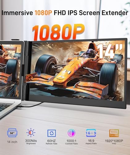 Laptop Screen Extender, Ultra-Thin 14″ FHD 1080P IPS Portable Monitor for 13″-17″ Laptop, 1.3lbs Lightweight Dual Monitor Extender, Plug & Play for Wins/Mac/Android/Chrome