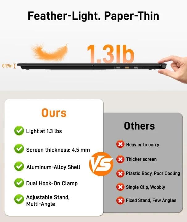 【Ultra-Slim & Ultra-Light】The upgraded Wixzet ultra-slim laptop screen extender is designed for true portability. Measuring only 6.5mm thick—thinner than most smartphones—and weighing just 1.3 lbs, it fits easily into any backpack or briefcase without adding bulk. Perfect for travelers, remote workers, and digital nomads, this lightweight dual-screen extender turns any space into your mobile office. It’s also a thoughtful, practical gift for anyone who values productivity on the go.