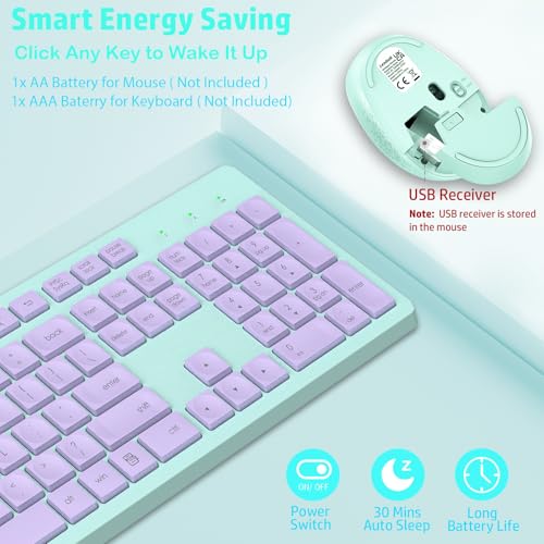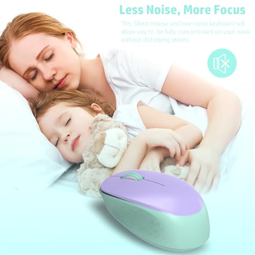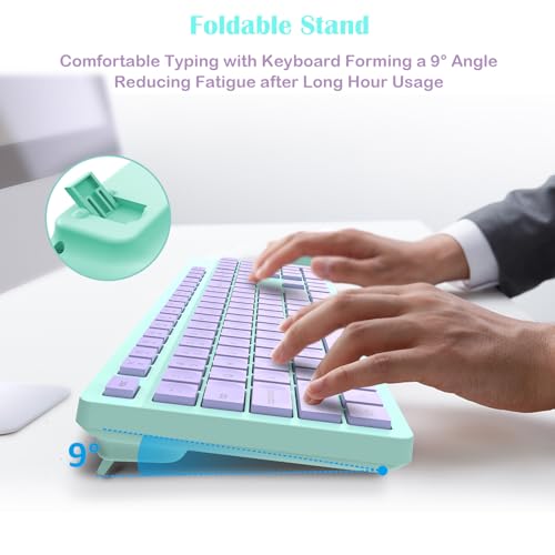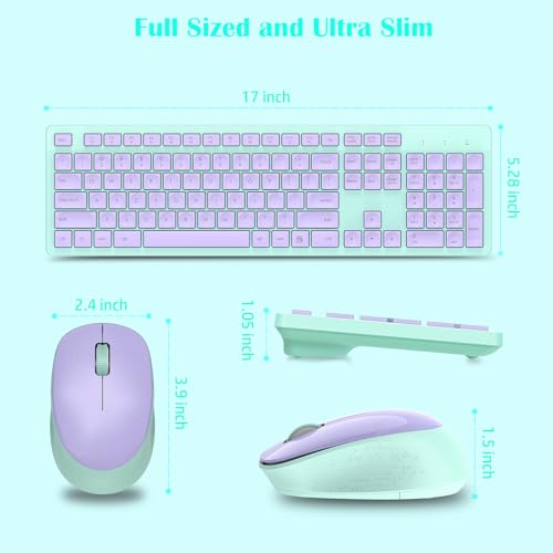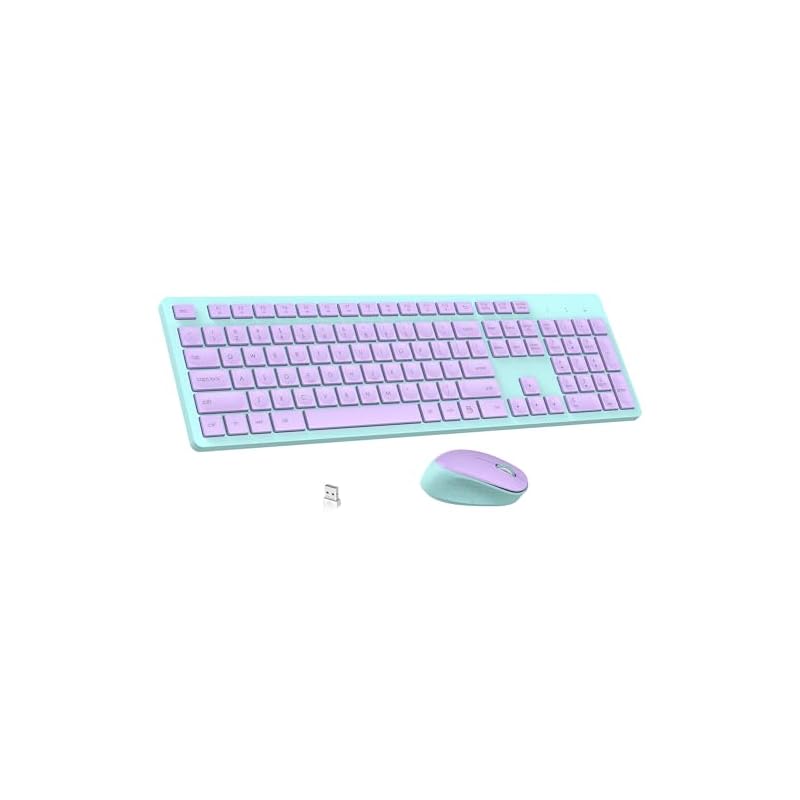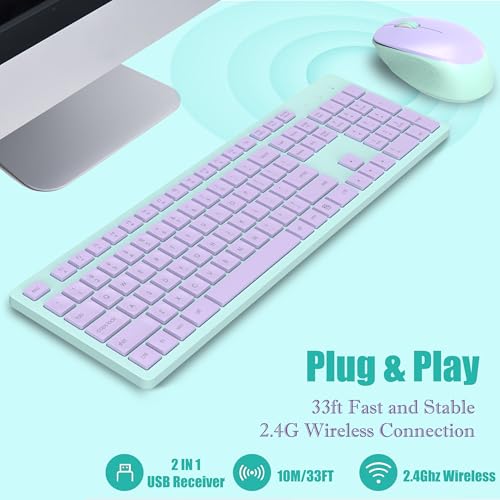 LeadsaiL K786 – Combo de teclado y mouse inalámbricos, 2.4 GHz sin retrasos, teclado ergonómico de tamaño completo, mouse silencioso para computadora portátil con Windows, Mac, PC, laptop, 12 accesos directos FN, batería de larga duración – Morado y menta