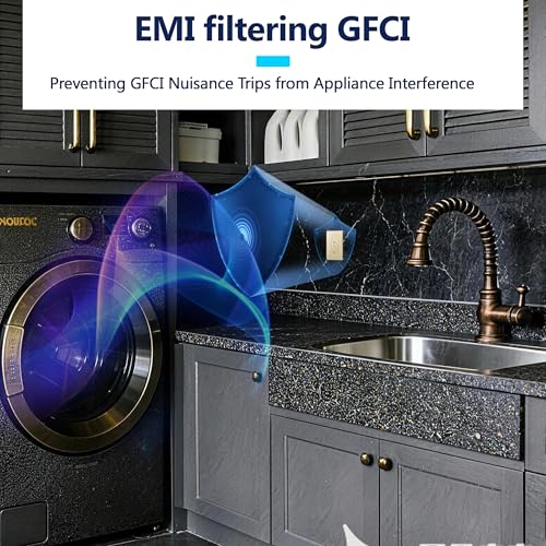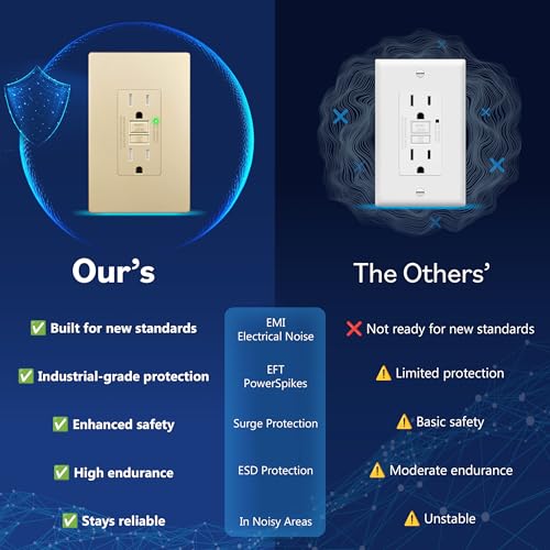 Especificaciones: LIDER Toma GFCI de 15 A, receptáculo resistente a manipulaciones con autocomprobación, indicador LED, certificación ETL y cumple con la FCC, protección antiinterferencias (sin falsos disparos), placa