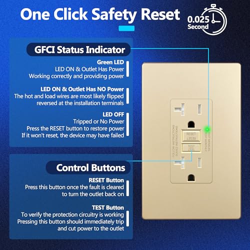 Autoprueba e indicador LED: cuenta con autocomprobación integrada para garantizar un funcionamiento adecuado. Un indicador LED intuitivo proporciona retroalimentación en tiempo real: el verde sólido confirma el cableado correcto, el rojo parpadeante indica un neutro abierto, y el rojo sólido o parpadeante significa que el GFCI se disparó y necesita ser reiniciado.