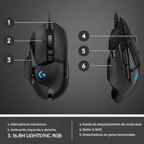 Iluminación RGB programable y tecnología Lightsync: Personaliza la iluminación entre casi 16.8 millones de colores para que coincida con los colores de tu equipo o sincroniza los colores con otros equipos Logitech G en este mouse con cable para juegos