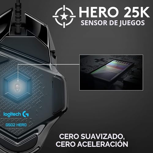 Logitech G 502 HERO Ratón para juegos con cable de alto rendimiento, sensor HERO 25K, 25,600 DPI, RGB, pesos ajustables, 11 botones, memoria integrada, PC/Mac