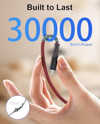 【Superior Nylon Braided Durability】 Engineered for longevity, this long Lightning cable features a rugged double-layer design: a tough outer nylon braid that resists daily wear and tear, combined with a reinforced internal structure that can withstand over 12,000 bends. Say goodbye to fraying and broken cables at the connector ends.