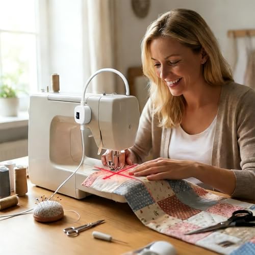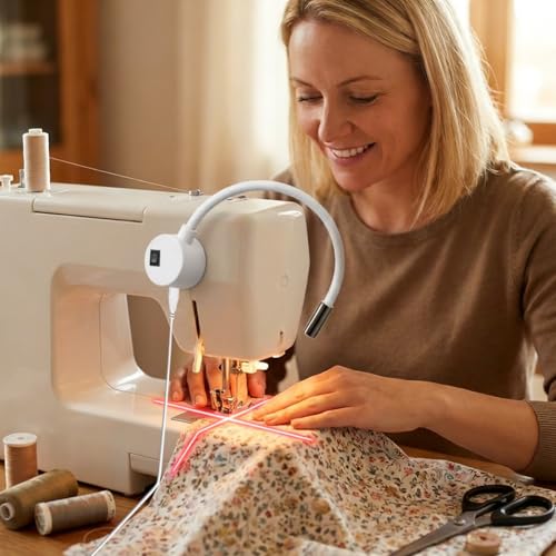 Orientación de precisión: proyecta una luz roja brillante en cruz para mostrar la colocación exacta de la aguja, lo que permite costuras rectas y acolchado sin tiza ni bolígrafos. Perfecto para cremalleras, costuras superiores y trabajos de borde