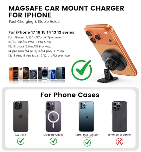 Modelos aplicables: este cargador de montaje para automóvil Mag-Safe es compatible con iPhone 17/17Pro/17air/ 16/16 Plus/16 Pro/16 Pro Max iPhone 15/15 Plus/15 Pro/15 Pro Max/14/14 Plus/14 Pro/14 Pro Max/13/13 Pro/13 Pro Max/12/12 Pro/12 Pro/12 Pro/12 Pro/12 Pro/12 Pro/12 Pro/12. Pro Max. No apto para iPhone 13/12 Mini. Si tu teléfono lleva una funda magnética, la cartera Mag-Safe también se puede adaptar