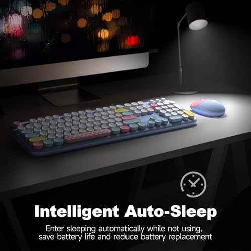 Modo de suspensión automática: nuestros lindos combos inalámbricos de teclado y mouse coloridos requieren solo 1 batería AA. El teclado y el mouse inalámbricos entran automáticamente en modo de suspensión después de 5 minutos de inactividad, ahorrando eficientemente la duración de la batería y reduciendo la necesidad de reemplazos frecuentes.