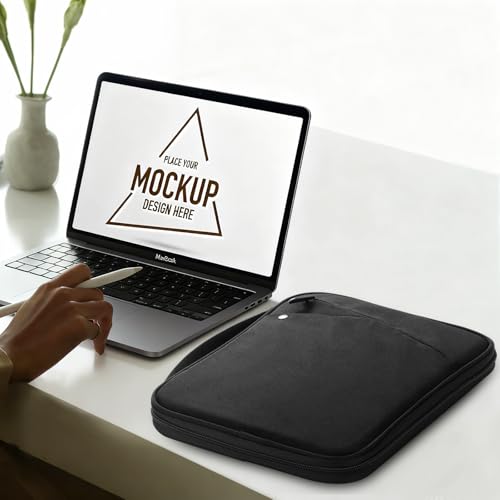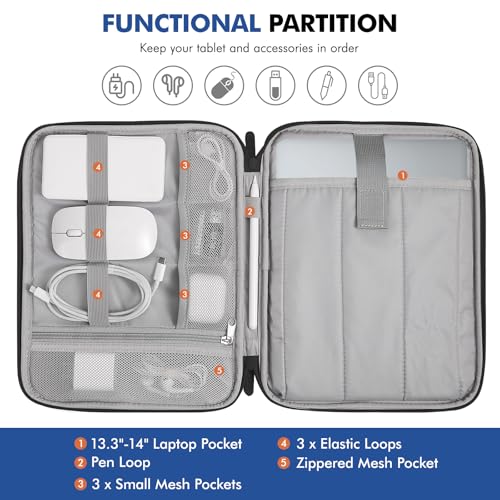 Satisface las necesidades de almacenamiento: hay bolsillos clasificados para tus dispositivos y accesorios relacionados, cuyos bolsillos incluyen bolsillo para laptop de 13.3 a 14 pulgadas, lazo para bolígrafo, 3 bolsillos pequeños de malla, 3 bucles elásticos y un bolsillo de malla con cremallera. La funda para laptop con asa puede mantener tu laptop y accesorios en orden.