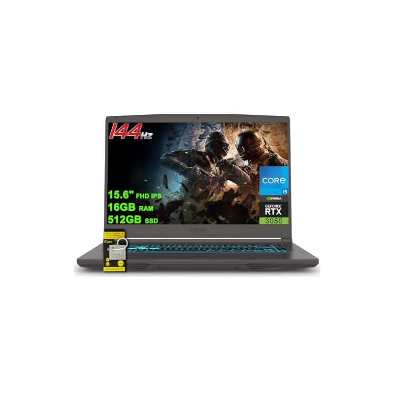 Especificaciones: MSI Portátil para juegos Thin 15 15.6″ FHD IPS 144Hz Intel 8-core i5-13420H (Beats i7-11800H) 16GB RAM 512GB SSD NVIDIA GeForce RTX 3050 retroiluminado USB-C Win11 con concentrador ICP