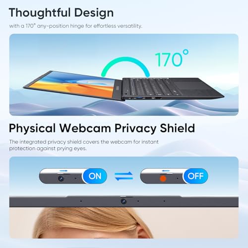 Experiencia de usuario mejorada: Manténgase conectado y productivo con una batería de 34.2Wh que dura hasta 5 horas, lo que convierte a esta computadora portátil en un compañero de viaje ideal. El obturador de privacidad en la cámara web, la apertura de bisagra de 170° para una visualización flexible y un teclado ergonómico con un panel táctil suave son adiciones pensadas que se adaptan tanto a la comodidad como a la seguridad.