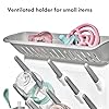Un lugar para todas las cosas del bebé: pezones secos y mordedores en el compartimento awesome, biberones y tazas secos en las 13 clavijas en ángulo, utensilios secos en las dos copas laterales y tapas secas y anillos de biberón en las dos bandejas inferiores con crestas elevadas para atrapar todos los goteos.